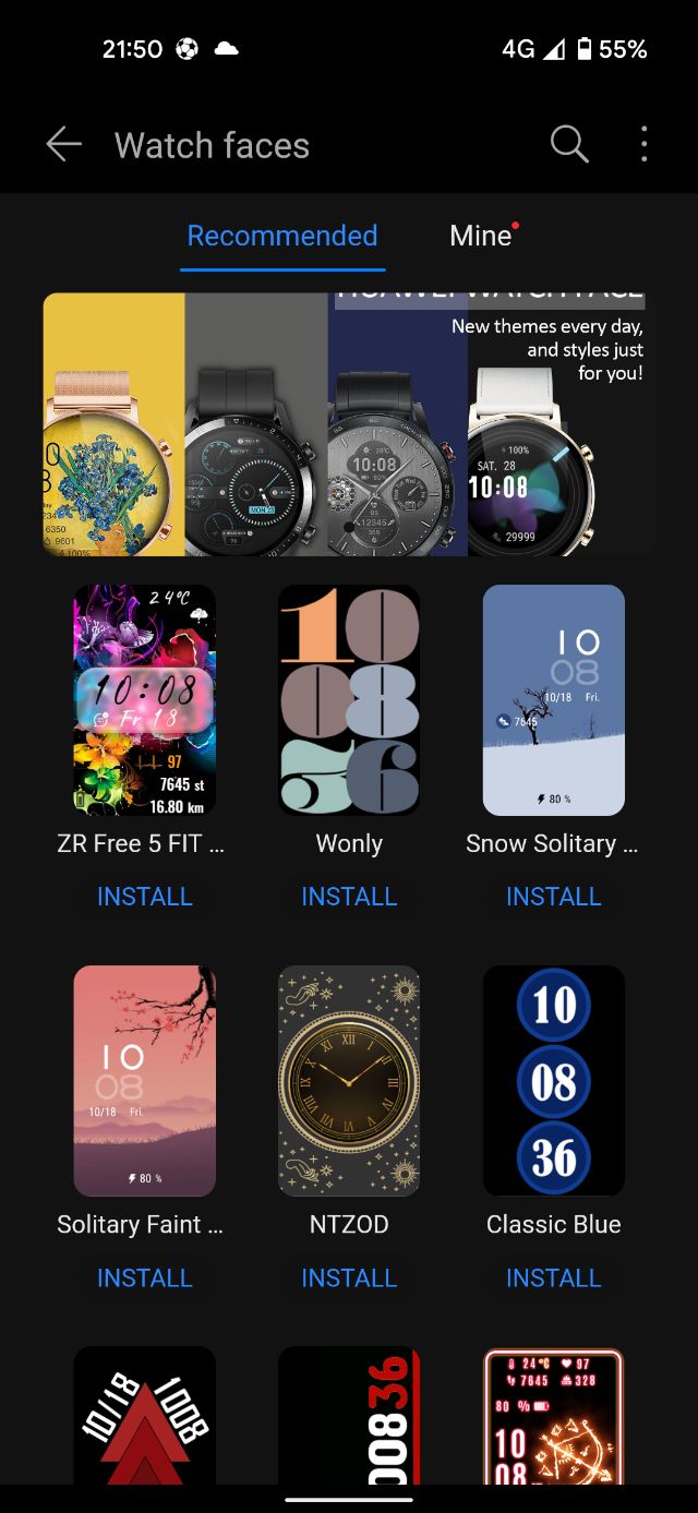 Je kunt kiezen uit de standaard watch faces, maar je kunt ook in de Recommended kijken en verschillende nieuwe watch faces downloaden en installeren. Zeker de moeite waard om even in te kijken en een mooie watch face uit te zoeken.